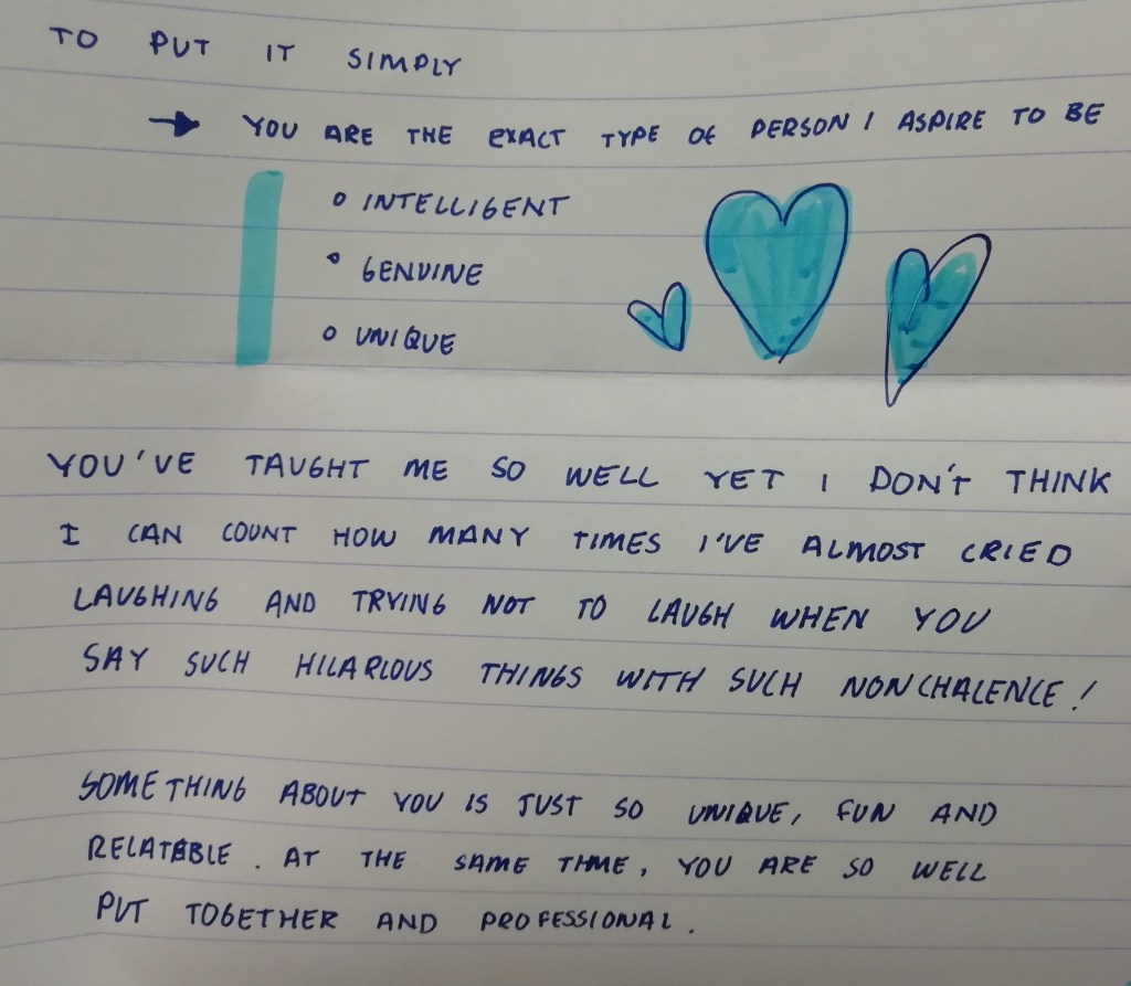 I feel emotional, I feel overcome and I feel very humbled. I can’t actually believe that a student would write this about me. But I am very glad that they did. I pin it proudly to my notice board and know it’ll be there for as long as I am.