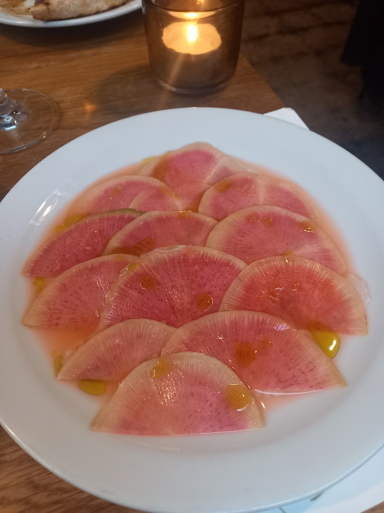 The food is ‘small plates designed for sharing’ and it is delicious. Each individual dish is a treat but put them together and, oh my goodness, it is a taste sensation. We need a bit of help and the waitress is fantastic, advising of number of plates and recommending the ‘spectacular’ walnut flat bread, which is divine. To wash it all down, we choose a bottle of vin naturel and 1 o’ clock quickly becomes 2 o’clock and then 3. Fabulous company and fabulous ambience. The stresses and strains of a busy term and the worries of family life just melt away and I open the door to holiday, relaxation and the chance to have some fun.